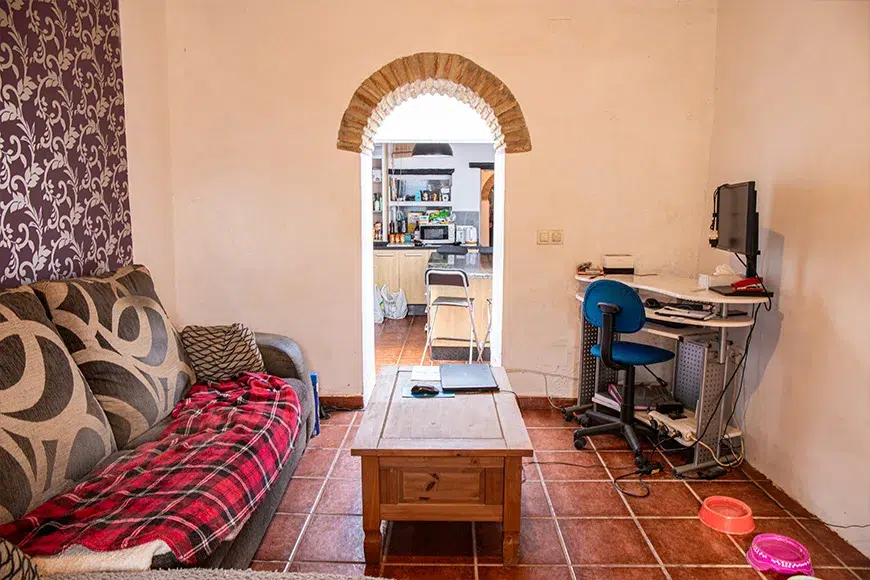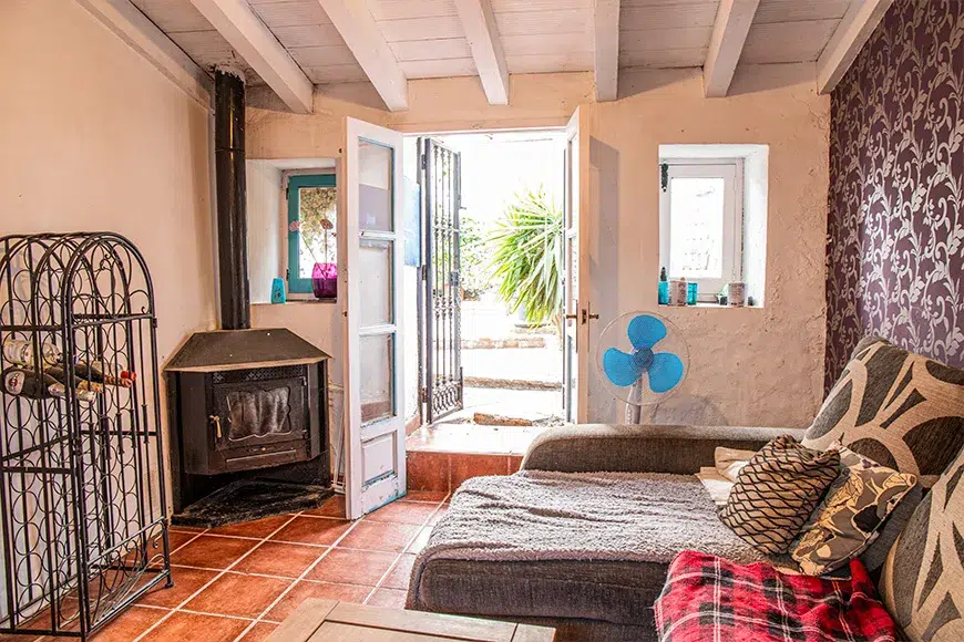 Sorry now sold … This 2 bed, 2 bath property is in the old quarter of Jimena de la Frontera. The property is on a cobble-stoned street and near wonderful walks. On entering the property you are met with a study – which can also be used as an extra single room, and a small sitting room where the staircase to upstairs leads off from, near the first bathroom. It is a charming property with beams and old stone work revealed to add to its allure. There is a wide hallway/ further room, cosy, wood burning stove and further sitting/dining room near the modern kitchen. From this point you access the welcoming patio, complete with lemon tree.