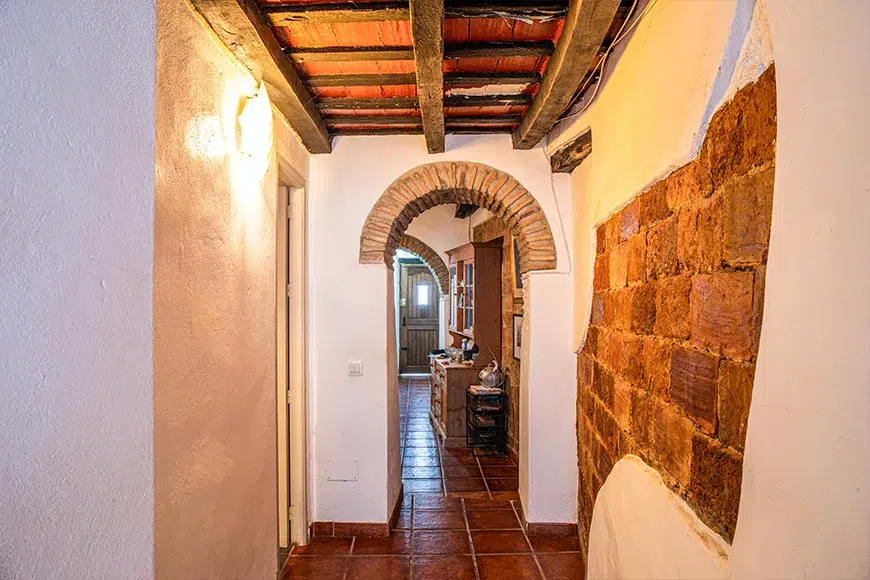 Upstairs are the 2 bedrooms and one of the two bathrooms. The guest bedroom has a sloped ceiling and is ideal for adults or children. The majority of the room has a full height ceiling. It is a very atmospheric and quaint property. This second bedroom looks out over the patio and hills of the Los Alcornocales Natural Park. The master bedroom overlooks the kitchen which was added as an extension some years ago. The patio measures approximately 10 m2 and the built surface area of the property is approximately 70 m2 ground floor and 50 m2 on the first floor, including a storage area.