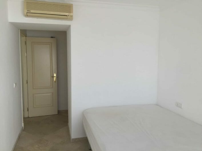 This is a duplex town house, with front door accessed via 2 or 3 steps and views straight down to the sea. The fully equipped kitchen is on the right and leading from it is a drying area. Opposite is the first bedroom and the downstairs bathroom is between this and the living area. The sitting/dining room leads out onto a large terrace with barbecue area. Coming back into the property, the other 2 bedrooms are upstairs. All are doubles with built in wardrobes. The master has an ensuite bathroom and the second room can have its own bathroom, but it is not ensuite. All 3 bathrooms have natural light coming in. Some properties in this development have had glass curtains added to create an extra room and all that would be required is to request permission in advance from the Community of Owners as precedent has already been established. This is sold with all furniture and air conditioning units. Great value, buy and let out for golfers, ramblers and beach goers.